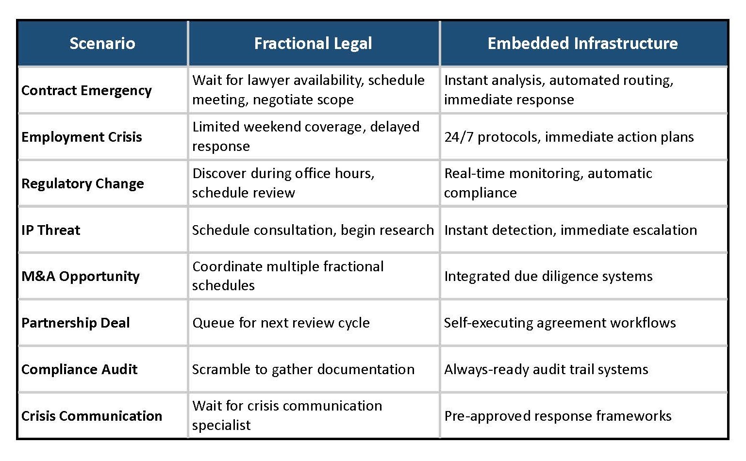The incompatibility is absolute: business velocity depends on decision speed, but fractional availability depends on lawyer schedules. When competitive advantage requires immediate decisions, scheduled availability creates systematic disadvantage.